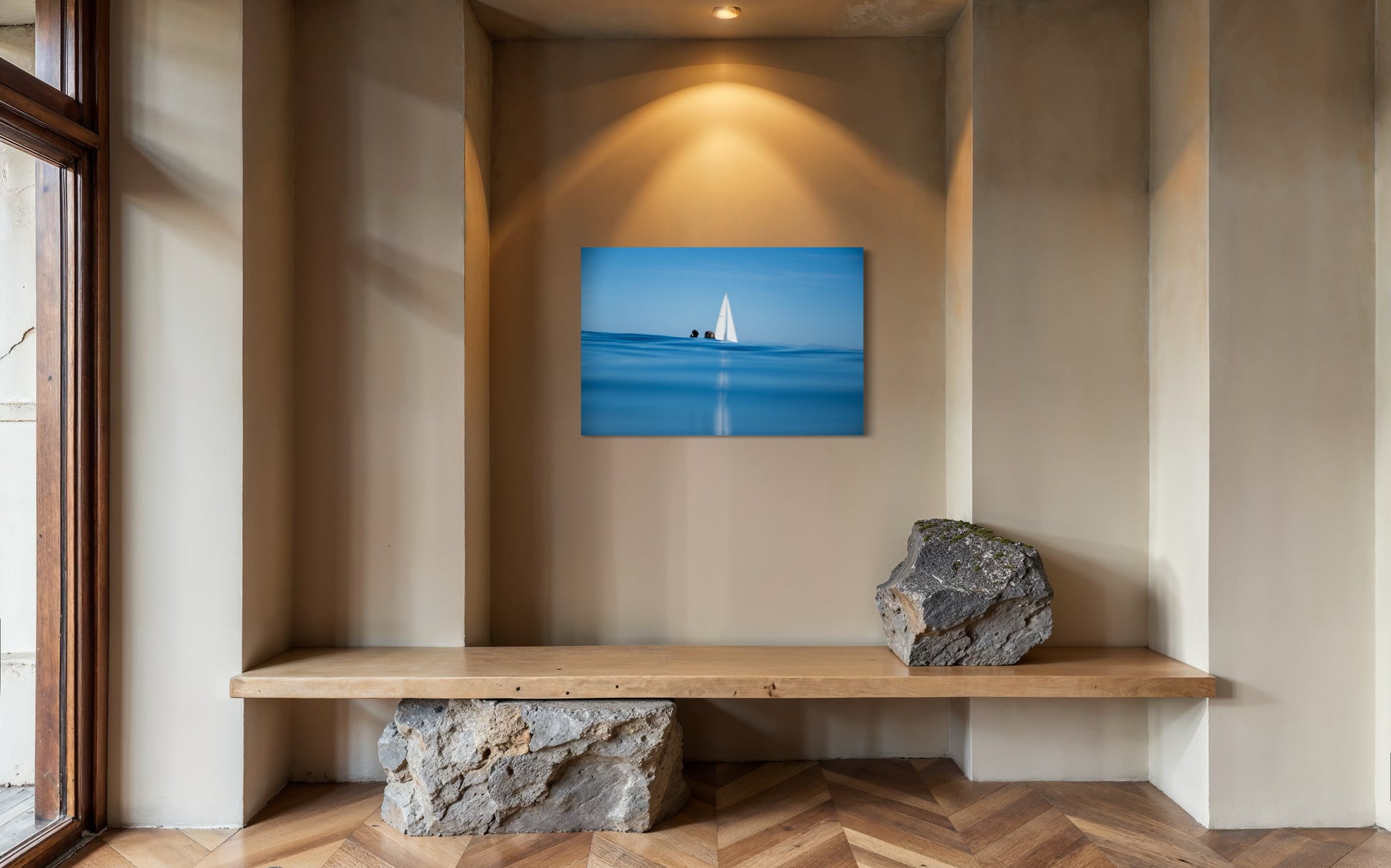 Aluminum (Mounted) - The image is vividly printed on premium aluminum through an advanced dye sublimation process, ensuring a durable, striking display. The aluminum print is mounted to an Inset Metal Frame, offering a sleek, modern, unframed aesthetic. The black metal frame, inset from the print’s edge with a 1-5/16” depth, is finished with a wire hanger for effortless installation.
