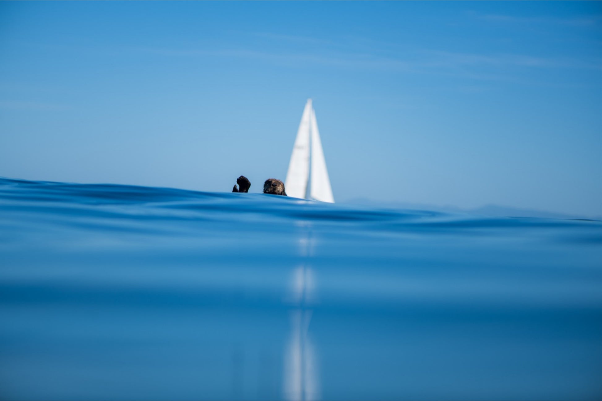 Morning meditations with a Sea Otters gentle presence reflecting amid the tranquil ocean and distant sail.