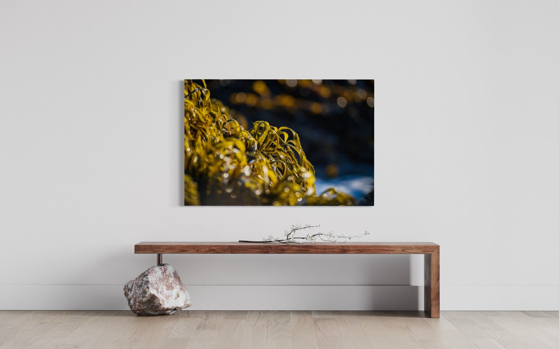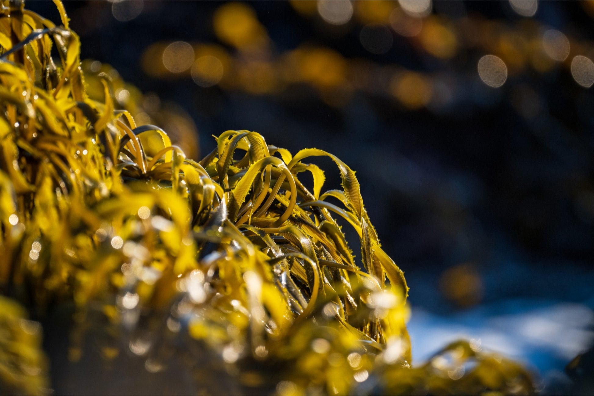 Sunlit kelp ribbons peak above ocean currents, golden and ephemeral.